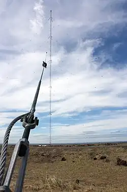 The mast, which is among the tallest structures in Western Europe, is insulated against the ground, and guyed at five levels by steel ropes, which are subdivided by insulators. It was built in 1963 to replace the 190.5 m (625 ft) tall LORAN-C mast, constructed in 1959 for the North Atlantic LORAN-C chain (GRD 7970).[2] A second, smaller, 30 m (98 ft) tall tower was installed by the US Coast Guard in the autumn of 1961 as part of a LORAN-A network paired with Greenland.