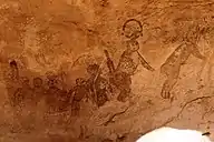 Günther researched contemporary African dances. He documented introduction and influence of rumba in African culture after 1930, and its popularization after 1945.[14] Günther suggested that a rock art discovered by Henri Lhote in Tassili n'Ajjer depicting eight dancers from 6000–4000 BC featured similarities to a contemporary Zulu dance, called indlamu.[15]