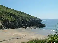 Author David Clegg describes the beach as "small and sandy and just one lovely granite cottage",[2] while the Rough Guide to Britain notes the rocky outcrops, inlets and coves in the vicinity.[3] 0.75 miles (1.21 km) to the east is Lambsoden Cove, accessed via a coastal footpath. There is an estate there with 70 acres of farmland.[4] Nearby is Dead Man Point.[5]