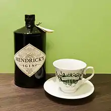 Hendrick's Gin is a brand of gin produced by William Grant & Sons at the Girvan distillery, Scotland, and launched in 1999.[2] The brand was created by spirits marketer Steven Grasse, while the gin itself was conceived by Lesley Gracie, a Yorkshire native, who was hired by William Grant & Sons to work in new liquid development for some of their products. A decade later she was tasked with creating a new super-premium gin.[3][4] In addition to the traditional juniper infusion, Hendrick's uses Bulgarian rose and cucumber to add flavour. Hendrick's gin is bottled in a dark brown, apothecary-style bottle.