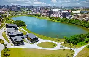 The Hengshan Calligraphy Art Museum is a two-story building with a floor area of about 3,000 m2 (32,000 sq ft). It is the first official art museum in Taiwan with the theme of calligraphy. The architect is Tianyi Pan. The design of the pavilion area is based on the imagery of the park as the inkstone and the pond as the inkwell. The exterior of the building is in the form of seals, consisting of five square boxes from left to right.[3][4][5]