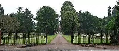 The landscape park was laid out in the late 18th century and the formal gardens created by Edmund Thomas Wedgwood Wood after he bought the site in 1874. Notable features include Pulhamite rockwork, a ha-ha, an Elizabethan octagonal dovecote and a walled garden. There is also a former sunken garden created by Italian prisoners of war. The estate is surrounded by yew hedges, although the original yew maze has been lost.[3] The main gates were brought from Wirksworth Hall in Derbyshire during the 19th century.