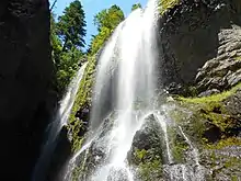 Henline Falls has a height of 126 feet (38 m) and a width of 50 feet (15 m).[1] Henline Creek supplies the flow of water to the falls.