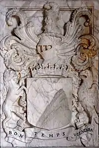 His widow erected in the south aisle chapel of Tawstock Church a large monument to her husband,[lower-alpha 1] deemed "splendid" by Pevsner,[22] "massive and ugly" by Hoskins[23] and "almost unequalled in singularity and absurdity" by Marland.[24] It consists of a free standing base of black and white marble on which sit four white marble dogs supporting on their shoulders a big black square bulging sarcophogus. On each of the four corners is a black obelisk.[22] On the sides of the base is a lengthy epitaph in Latin.[25]