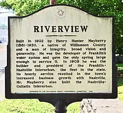 The Henry H. Mayberry House, also known as "Riverview", is a private home in Franklin, Tennessee located on Franklin Pike (US 31) just north of the Harpeth River Bridge. Built in 1902 in Neo-Classical or Classical Revival architecture, it is one of the notable residences of the 1900-1935 period in Williamson County.[lower-alpha 1] At the time it was built it had the most technologically advanced utilities in the county, including electric lights and its own water works. It was listed on the National Register of Historic Places in 1988. When listed, the property included an area of 26 acres (11 ha).[3]