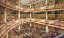 Hyams was a partner in the Paignton, Devon practice Hyams and Hobgen, and is noted as the architect of two restaurants in the county, the first a detached seaside café for Deller's Supply Stores in Paignton, the second a much larger multi-story design for Deller's in Exeter city centre, completed in 1916. Harold Clunn in his 1929 Famous South Coast Pleasure Resorts Past and Present described the Paignton cafe as one of the finest on the south coast. The Exeter cafe, galleried across three floors, was decorated with Arts and Crafts oak panelling and brightly coloured Art Nouveau plaster friezes.[2] Hyams' design for the Exeter cafe was selected for the Royal Academy Summer Exhibition in 1922.[3]