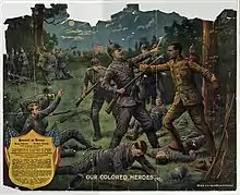 The French Army assigned Johnson's regiment to Outpost 20 on the edge of the Argonne Forest in the Champagne region of France, equipping it with French rifles and helmets.[9] While on observation post duty on the night of May 14, 1918, Johnson came under attack by a large German raiding party, which may have numbered up to 36 soldiers. Using grenades, the butt of his rifle, a bolo knife and his bare fists, Johnson repelled the Germans, killing four while wounding others, rescuing Needham Roberts from capture and saving the lives of his fellow soldiers. Johnson suffered 21 wounds during the ordeal.[3][9] This act of valor earned him the nickname of "Black Death", as a sign of respect for his prowess in combat.