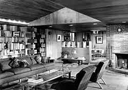 George Matsumoto, architect of the Ritcher House, and Kamphoefner designed the Kamphoefner House in 1948. The home was constructed in 1950. It is an example of Frank Lloyd Wright's Usonian mode of design, characterized by small scale, affordable construction, open plan interiors, integration of interior and exterior spaces, flat roof and large glazed areas such as windows and doors. The house is oriented around a large, central brick chimney. The rear of the house features large insulated windows, the first of its kind in Raleigh. These windows face a large open terrace and offer a view of the nearby golf course. The front of the house contains no windows, allowing privacy to the occupants.[2][5]