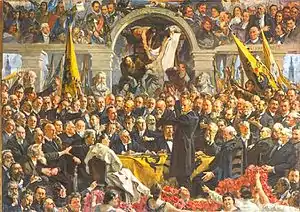 One of his most famous works is The Golden Canvass of Flanders ('Het Gulden Doek van Vlaanderen') in which Luyten depicts a fictional meeting of the one hundred odd people who in his opinion played a key role in Flemish history and the Flemish movement. Catholic or liberal, activist or anti-German, alive or already deceased, he portrayed all against the backdrop of Rubens' Descent from the Cross. He worked on the painting for more than 10 years. It was donated to the IJzertoren (Yser Tower) where it is kept in the museum.[3]