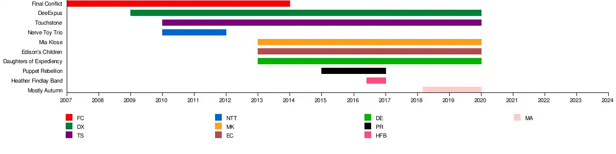 Over the years, Rogers' abilities and talents have grown enormously and have secured him full time positions with Touchstone, DeeExpus and Marillion side project Edison's Children;[3] he continues to impress with his drumming skills, playing for both Puppet Rebellion,[4][5] who he joined in October 2015, and Mia Klose[6][7] as well. He is now in such demand that, along with all his full–time band activities, he also plays with The Daughters of Expediency (Alan Reed's live band) and has also played with the Heather Findlay Band.[8][9] He has also played at several festivals, both large and small, with some of these bands – High Voltage[10] (2010), RoSFest (2010[11] and 2012[12]), Download,[13][14] Kendal Calling[15][16] and Summer's End 2014[17] and 2016[18][19]) to name but a few... and he has played as tour support for artists such as Marillion[20][21] and Steel Panther[22][23] across the UK and Europe.