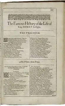 Henry VIII is a collaborative history play, written by William Shakespeare and John Fletcher, based on the life of Henry VIII.[1] An alternative title, All Is True, is recorded in contemporary documents, with the title Henry VIII not appearing until the play's publication in the First Folio of 1623. Stylistic evidence indicates that individual scenes were written by either Shakespeare or his collaborator and successor, John Fletcher. It is also somewhat characteristic of the late romances in its structure. It is noted for having more stage directions than any of Shakespeare's other plays.[2]
