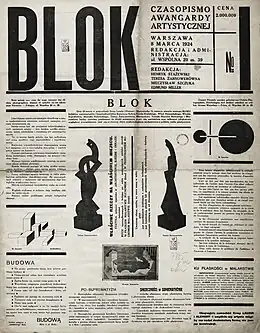 At Blok, Stażewski collaborated with Henryk Berlewi and Szczuka who were considered leading figures in Polish avant-garde typography. After Blok was dissolved in 1926 due to internal disagreements, Stazewski became one of the co-founders of the avant-garde collectives Praesens (1926–1929) and later a.r. group (1929–1936), both of which also became critical in defining the direction of Constructivism in Poland.[5] As a member of these groups, Stażewski contributed to Polish Constructivism through typography, posters, theoretical writings (including publications for the Blok magazine published between 1923 and 1926), as well as interior design and furniture design.[9] Though predominantly idealistic and of limited impact on the Polish post-World War I society, the Constructivists completed some important architectural projects (Praesens, for instance, participated in the design of apartment buildings for the Warsaw Housing Cooperative in the Rakowiec district)[7]:123–124 and imbued the Polish avant-garde, up until then largely autonomous, with a sense of social commitment.[7]:128