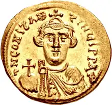 - 1 2 Heraclonas' full name is sometimes given as "Constantinus Heraclius" on the authority of Theophanes, who calls him "the younger Constantine, also called Herakleios". Constantine III is referred as "his own brother, the little Constantine". On this basis, Philip Grierson attributed to Heraclonas several coins previously thought to represent Constans II.[2] However, George E. Bates used other numismatic evidence to show that the emperor depicted is indeed Constans II, and that Heraclonas only ruled as "Heraclius".[3]