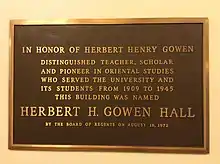 In 1909 Gowen became the founding chair of the University of Washington's Department of Oriental Subjects, a post he would hold until 1929.[1][3] Gowen continued to teach at the University of Washington until 1938, and would continue to be affiliated with the university until 1945.[1][3]
