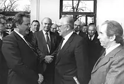 Mies (left) receives a delegation from East Germany headed by Horst Sindermann in Bonn, 1986