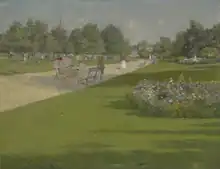 In June 1857, the Common Council of the City of Brooklyn voted to establish Tompkins Park, making it the first park established by the city of Brooklyn.[9] Funding was achieved six months later, as the incorporation papers were misplaced and had to be relocated.[10] In 1870, the Parks Commission took control of the park, and in 1871, James Stranahan commissioned Calvert Vaux and Frederick Law Olmsted architects for Central and Prospect parks to submit a plan for the park.[8][10] The land was originally named Tompkins Park, after former New York governor Daniel D. Tompkins.[7] The original design was highly symmetrical and did not include any trees or paths, believing they would be used "for clandestine purposes by people of bad character." In the 1870s and 1880s, the park was used for military review as well as public leisure; in 1875, the Tompkins Park Croquet Club was formed.[10][11] In 1878, a shelter and veranda meant for women and children was constructed.[12][10] In 1899, the Tompkins Park Library, located in the center of the park, opened under Public Library Association, and in 1901, it became a part of the Brooklyn Public Library system.[13][14] Artist William Merritt Chase, a resident of Bedford-Stuyvesant, was a frequent visitor of the park and painted it at least five times in the 1880s, creating some of the earliest color representations of the neighborhood.[15] The park also underwent improvements in the 1910s, with a concert space being constructed in 1915.[16][8] In 1916, the library and women's shelter were also renovated and combined.[17]