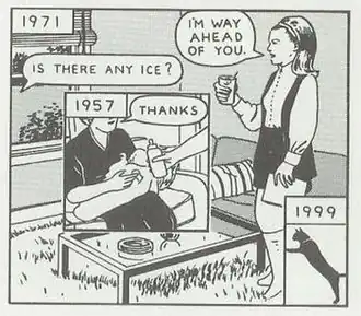 "Here" has been recognized as a groundbreaking experiment with the formal properties of comics. Douglas Wolk wrote that its "influence has echoed through art comics for decades."[2] Its influence is particularly notable in the work of Chris Ware, who wrote a lengthy essay on it in the magazine Comic Art #8. "Here" was also reprinted for the first time in that issue. It has been frequently anthologized since its original publication.
