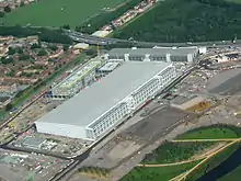 The design of the complex, which was 275 metres (902 ft) long, was by Allies and Morrison.[6] It had a catering village and a multi-storey car park to link the two main venues (the IBC and the MPC) together.[6] The construction cost was £355 million[1] and the main contractor was Carillion.[7] It was completed in July 2011.[8]