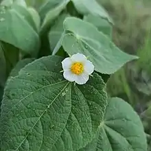Herissantia crispa is a species of flowering plant in the mallow family known by the common names bladdermallow and curly abutilon. It is native to the tropical Americas but it can be found throughout the tropical and warmer temperate world as an introduced species and sometimes a weed. This is a perennial or sometimes annual herb growing up to about 1.5 meters in maximum stem length, usually taking a trailing or creeping form. It is coated in whitish hairs. The oval or heart-shaped leaves are up to 7 centimeters long with rippled edges. The inflorescence is a solitary flower emerging from a leaf axil, borne on a long-haired pedicel which is half erect and then jointed downward. The flower has five pale yellow oval petals each up to a centimeter long. The fruit is a lantern-like inflated sphere ribbed into segments. It is up to 2 centimeters wide, coated in long hairs, and dehiscent, each segment containing 2 or 3 black kidney-shaped seeds.