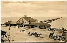 It was built all of timber, with the piles being driven straight into the sea bed; it was "considered at the time the best specimen of pile-driving", and described as a "pier and breakwater".[2] There was curved stone balustrading at the entrance, taken from old London Bridge which was demolished in 1831. A sail trolley vehicle running on tracks, powered by sail and foot and nicknamed Neptune's Car, ran the length of the pier from 13 June 1833, carrying passengers and baggage. When wind was inadequate as commonly happened, pier employees physically pushed the trolley.[7] The pier's length was defined by the one-fathom draught of the paddle steamers and the shallow two-fathom depth of the sea even three quarters of a mile offshore at high tide. It was followed in 1861 by the railway station, and thus began the town's growth into a holiday resort.[8] However, because the wooden piles were never protected by copper sheathing they suffered from shipworm. By 1850, many piles had been replaced with iron ones, or with wooden ones "prepared by Mr Payne's process" against shipworm,[2] but as a whole they showed irreversible deterioration from 1860 onwards. Pier dues were considered expensive at 1s 6d.[2] Subsequently, the first Herne Bay Pier Company failed due to competition between paddle steamers and the new railway which was opened on 13 July 1861, because previously most visitors arrived by steamer, then they all arrived by rail. The first pier was taken down in 1870 to 1871,[3] long after the paddle steamers stopped coming in 1862.[4][5][6]