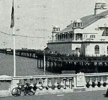In 1950 the pier tram was sold for £12 10s because it could not pass the Bailey bridges, and replaced by a narrow-gauge steam railway which was gone by 1959.[3] On 1 March 1949 the pier entrance suffered sea-storm damage, and again between 31 January and 1 February in the North Sea flood of 1953, when a twenty-foot storm surge swept past the old pier-master's house, Richmond Villa, and as far as the High Street.[12] As a result, in 1953 the stone balustrade from London Bridge, set at the entrance in 1833, was taken down and replaced with railings. The present whereabouts of the balustrade is unknown. In January 1963 the surface of the sea froze for weeks in the curved shapes of sea spray as far as a mile offshore. The tide continued to go in and out under its white crust, leaving the pier surrounded by ice.[13] Rapid thaw then caused stress to the piles, exacerbated by previous storm damage and neglect.[3] The summer of that year saw the last visit by PS Medway Queen. By 1968 the seaward end of the pier had been closed and abandoned. In September the same year insurance was withdrawn for the deep sea part of the pier beyond the pavilion, and the public excluded. The Grand Pier Pavilion was refurbished at a cost of £158,000 but was destroyed by fire possibly caused by a spark from a welding torch during pier entrance reconstruction in June 1970. The building burned down within hours, to the distress of Herne Bay.[3] As replacement, the Pier Pavilion was designed in 1971 by John C. Clague, opened by Edward Heath on 5 September 1976, and called The Cowshed by the public.[14] Meanwhile, ownership of the pier was transferred to Canterbury City Council on 1 April 1974 merger.[6]