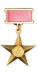 The title Hero of the Democratic Republic of Afghanistan (Pashto: افغانستان دیموکراتیک جمهوریت اتل‎) was the highest distinction in the Democratic Republic of Afghanistan, awarded to both citizens of the Afghanistan and other states who have performed heroic deeds in the name of defending the gains of the Saur Revolution, freedom, territorial integrity and independence of the Democratic Republic of Afghanistan or who have made an outstanding contribution to strengthening the defense of the Afghan state. It was awarded alongside the Order of the Saur Revolution and the Order of the Sun of Liberty.[1][2][3]