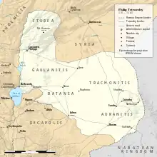Philip ruled territories which the Gospel of Luke lists as Iturea and Trachonitis[1] and Flavius Josephus lists as Gaulanitis, Trachonitis and Paneas[2] as well as Batanea, Trachonitis, Auranitis, and "a certain part of what is called the House of Zenodorus".[3] The city of Caesarea Philippi served as the capital of his tetrarchy.