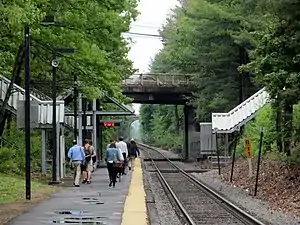 The Needham cutoff opened on November 4, 1906, from West Roxbury to Needham Junction, allowing trains from the former New York and New England Railroad to reach Boston without needing to use the New York Central's Highland branch.[1] Building the cutoff required a significant length of difficult rock cuts - "one of the heaviest pieces of short railroad construction ever attempted in New England" - reaching a depth of 57 feet (17 m) at Great Plain Avenue.[4] Needham Junction was originally the only stop on the cutoff; Bird's Hill opened as an infill station at Great Plains Avenue in 1917.[1][5]