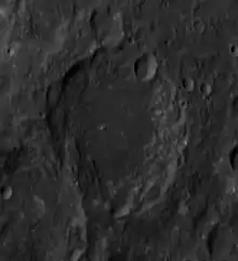 This is a somewhat worn crater formation with a wide inner wall. There is a pear-shaped crater along the northern inner wall. The interior floor is relatively featureless, with only a small ridge offset to the southwest of the midpoint.