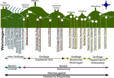 - ↑ Wein.de (German Agricultural Society): Hessian Mountain Road (Hessische Bergstraße) Archived 30 October 2007 at the Wayback Machine, read on 1 January 2008