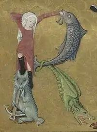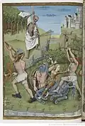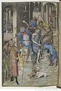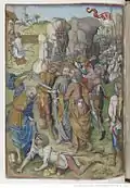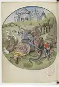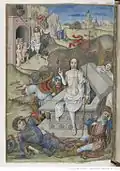 Testard has been influenced here by Netherlandish printmaker Master I. A. M. of Zwolle's Battle of Two Men with a Centaur, to which he introduces Death, a lion and a wild-woman.[8] Interpretation of this scene is problematic. Typically understood to represent a Centaur battling the Lapiths, a purely mythological tale and unusual subject for use in the "Office for the Dead", Belkin posits that this contest between man and beast is "symbolic of the struggle against dark forces. The Centaur and the wild woman form a single unit—the personification of vice in terms of Christian allegory. The private nature of the Book of Hours leads one to infer that Charles used the allegory of the struggle with the Vices for his own political vendetta against his rivals, conveying in this enigmatic miniature his bitter enmity towards those who had wronged him."[9]