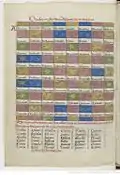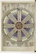 On the reverse of the Ave Maria is a diagram for calculating the date of Easter. Originally, "the vivid colours of the concentric circles behind the diagram must have stood out more clearly against the cream-coloured parchment [however] one of the components used to make the golden ground of the Ave Maria, probably silver, has gone rusty and seeped deep into the parchment". The main spoke, pointing up, features a sequence of nineteen Roman numerals representing years in the Metonic cycle.[11]