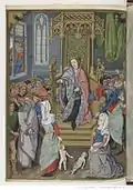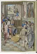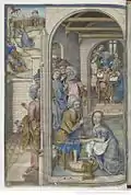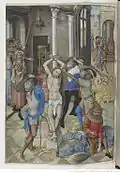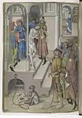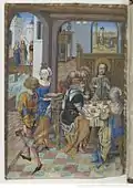 The composition of this scene is based upon a print by Master FVB. Testard has altered the faces, costumes and number of characters, introduced a lower viewpoint and made minor modifications to architectural details.[7]