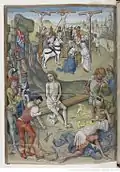 The folios most concerned with personal devotion, the Passion, Death and Resurrection of Christ (f. 106v), were in fact the work of the engraver Israhel van Meckenem, subsequently coloured by Testard with his characteristic luminous hues. Other work by painters such as Jean Bourdichon were included and may demonstrate Testard's honesty, his admittance that his talents were insufficient for the task. He also introduced some profane elements such as sexual encounters (ff. 4v and 20v), mythology (f. 41v) and chivalry (f. 53v). The text is entirely in Latin, and the book can be interpreted as being the antithesis of a book of hours, or even an anti-book of hours.[2]