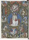 This miniature is adapted by Testard from an engraving by van Meckenem, itself a copy of an earlier 1466 print by Master E. S. The original print features John the Baptist in the centre, whom Testard has replaced with Christ amongst angels. Surrounding, the four symbols of the evangelists are arranged in a Latin cross: John's eagle (top), the winged lion of Mark (left), the bull of Luke (right), and Matthew's angel (bottom). The other medallions show the four doctors of the Church: Jerome with lion (top left); Gregory (top right), Augustine (bottom right), and Ambrose (bottom left).