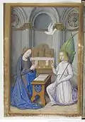 A book of hours is a manuscript designed for personal devotion and was popular in the Middle Ages. This illuminated work made for Charles, Count of Angoulême by the painter Robinet Testard is an unusual volume and is more comprehensive than just a set of devotions. The artist seems to understand his sponsor's character. As well as its devotional purpose, the book seems designed to entertain, to arouse curiosity (f. 52v), to amuse (ff 3r, 4v and 5r), to satisfy the sponsor's aesthetic sense (ff. 16v and 26v), to encourage his pastoral feelings (f. 20v), to encourage his chivalrous instincts (f. 2v) and even to flatter him (f. 41v).[2]