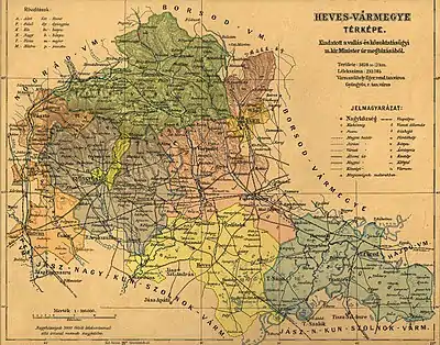 Heves county shared borders with the Hungarian counties Pest-Pilis-Solt-Kiskun, Nógrád, Gömör-Kishont, Borsod, Hajdú and Jász-Nagykun-Szolnok. It stretched from the Mátra and Bükk mountains to and across the river Tisza. Its area was 3,761 km2 (1,452 sq mi) around 1910.
