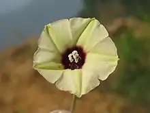 the 1-3 axillary (arising from the axil) flowers borne on each cyme[5][3][2][7] are found near the leaf joint,.[3] Each flower is bracteate (with bracts),[2][5] with a peduncle (flower stalk) between 1.5–10 cm (1–4 in) long.[5][7] The bracts are oblong-lanceolate shaped,[3] 0.7–1.5 cm (0–1 in) long, pubescent (covered with short, soft hairs) and acuminate (tapering to a point).[7] The inflorescences are bisexual (bearing both male and female reproductive organs),[5] with a pedicel (flower stalk) up to 3 cm long.[5][7] It has 5 sepals,[5][3] which are lanceolate to ovate shaped and up to 17 mm long.[5][7] The outer 3 are much larger than the inner 2 sepals,[5][3] and it can be identified from other similar coloured morning glory flowers by its overlapping sepals.[8] The corolla (the collective term for the petals) are campanulate (bell-shaped,[3]) to funnel-shaped,[2][5] 2–3.5 cm (1–1 in) long.[5][3][7] They are pale yellow, cream or white with a purple center,[2][3][7] The petals are pilose (covered with soft, weak, thin, and separated hairs) on the outside in 5 bands.[5][7]