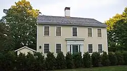 The Hezekiah Palmer House is located in eastern Branford village of Stony Creek, on the east side of Leete's Island Road just north of its junction with Stony Brook Road and Thimble Island Road. It is a 2+12-story wood-frame structure, with a side-gable roof, large central chimney, and clapboarded exterior. It has a rear leanto section giving it a classic New England saltbox appearance. The main facade is five bays wide, with sash windows arranged symmetrically around the entrance. The main entrance is framed by sidelight windows and pilasters, which support an entablature with cornice.[2]