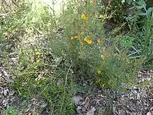 The erect and multi-branched shrub typically grows to a height of 0.25 to 1.0 m (9.8 in to 3 ft 3.4 in).[2] The small green leaves are around 20 mm (0.79 in) in length with a width of 1 mm (0.039 in).[3] It blooms between July and October and produces yellow flowers.[2] The flowers have a diameter of around 15 mm (0.59 in).[3]