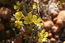 Hibbertia desmophylla is a species of flowering plant in the family Dilleniaceae and is endemic to the south-west of Western Australia. It is a sprawling or erect, hairy shrub with spreading, densely clustered, linear leaves and yellow flowers with eleven to thirteen stamens.