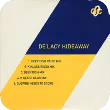 "Hideaway" is a song by American house music group De'Lacy, featuring vocals by Rainie Lassiter. It is the group's most successful single and is written by Kevin Hedge and Josh Milan, and produced by Blaze. The Deep Dish remix peaked at number-one in Italy.[2] It also reached number nine in the UK[3] and number 38 on the Billboard Hot Dance Club Play chart in the US. The song has been remixed and re-released several times. A remixed version, called "Hideaway 1998", which featured a mix by Nu‑Birth,[4] peaked at number 21 in 1998. The song was released a third time in 2006 and reached number 82 in the Netherlands.