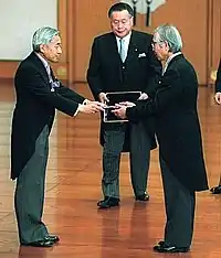 Emperor Akihito conferred the Order of Culture on Shirakawa (at the Imperial Palace on November 3, 2000)