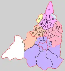 Purple=to Yonezawa City; Peach=to Nanyo City ; Yellow=to Nagai City; Blue=to Kaminoyama City; Orange=Kawanishi Town;Red=Takahata Town Town