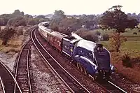 During the same period, British Rail also invested in a separate, parallel project to design a train based on conventional technology as a stopgap.[11] The InterCity 125, otherwise known as the High-Speed Train (HST), was launched in 1976 with a service speed of 125 mph (201 km/h) and provided the first high-speed rail services in Britain.[12] The HST was diesel-powered, and the Great Western Main Line (GWML) was the first to be modified for the new service.[13] Because the GWML had been built mostly straight, often with four tracks and with a distance of 1 mi (1.6 km) between distant signal and main signal, it allowed trains to run at 125 mph (201 km/h) with relatively moderate infrastructure investments, compared to other countries in Europe. The Intercity 125 had proven the economic case for high-speed rail,[14] and British Rail was keen to explore further advances.