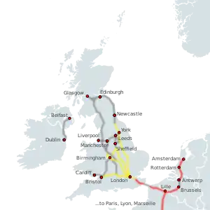 - ↑ Webster, Ben (3 July 2007). "London to Frankfurt in under 5 hours: Europe unites to speed up rail journeys". The Times. London. Archived from the original on 13 May 2008. Retrieved 6 July 2007.