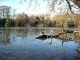 Highams Park Lake is to the west of the park, and is owned by the City of London Corporation although the rest of the park is maintained by the London Borough of Waltham Forest. The lake was formed by the landscape gardener Humphry Repton who created it by damming the River Ching. The lake, adjoining park and the Manor House (now Woodford County High School) were known as Highams Bensted. The last owner, Sir Thomas Courtenay Warner, built both the Warner Estate in Walthamstow and the Highams Estate; the latter bounds the park to the North and East.[2] The lake itself is about 450m long and about 80m wide at the widest point. At the south end of the lake is a boat house built by Kenneth Robert John Ford and owned by Waltham Forest South Scouts. The north end of the lake is much narrower and shallower, and it often dries out into mud in the summer. The River Ching flows past the lake but does not actually flow into it; a small outflow at the south end of the lake flows into the river.