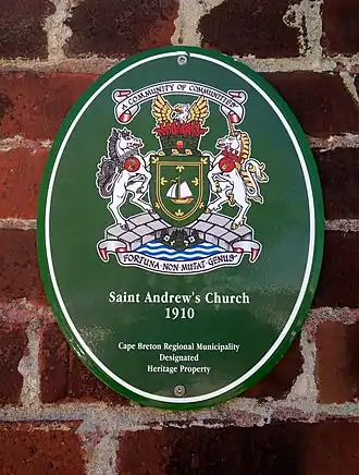 Municipal Heritage Property: On September 18, 2007, the Cape Breton Regional Municipality formally recognized St. Andrew's United Church as a Municipally Registered Property under the Nova Scotia Heritage Property Act, Chapter 199 of the revised Statutes, 1989, amended 1991, c. 10; 1998, c. 18, s. 561; 2010, c. 54[4][9] The Cape Breton Regional Municipality designated St. Andrew's Church and the property it sits on, recognizing St. Andrew's for its early and continuing presence in the community as well as the striking architecture. It is one of the few brick buildings in the area, and is impressive for its size and beauty.[4]