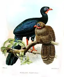 The highland guan grows to a length of 590 to 650 millimetres (23 to 26 in). The plumage of the male is black, the upper parts glossed with green or blue, the underparts rather duller. The iris of the eye is reddish-brown and there is reddish-brown or purplish bare skin around and behind the eye. The beak, the bare skin on the throat, the large wattle, the legs and feet are reddish-orange. The female, by contrast, is black, heavily mottled and barred with reddish-brown and cinnamon, with a red beak and bare skin round the beak, and purplish bare skin round the eye.[4]