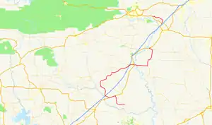The route runs west through sparsely populated pine forest, curving northward after Sycamore and crossing McNeeley Creek twice. Highway 51 crosses the Union Pacific Railroad tracks and a former alignment near Beirne, a small mill town. North of Beirne, Highway 51 begins a wrong-way concurrency with US Highway 67 (US 67). Less than two miles from the Nevada County line, Highway 51 turns north from the concurrency. Highway 51 intersects Interstate 30 (I-30) at a diamond interchange, then continues north through Burtsell. The highway begins paralleling the Caddo Valley Railroad and South Fork Terre Noir Creek, before crossing both shortly after entering the city limits of Okolona. In Okolona, the route passes the historic Okolona Colored High School Gymnasium, listed on the National Register of Historic Places (NRHP)[4] before an intersection with Highway 182. Highway 51 exits the town to the northeast, briefly overlapping Highway 53 to cross Terre Noir Creek near Holly Grove. Highway 51 turns east to Arkadelphia, passing the Terre Noire Natural Area, which contains blackland prairies and woodland complexes. Highway 51 serves as the eastern terminus of Highway 26 and passes the Bozeman House before entering the city limits.[5]